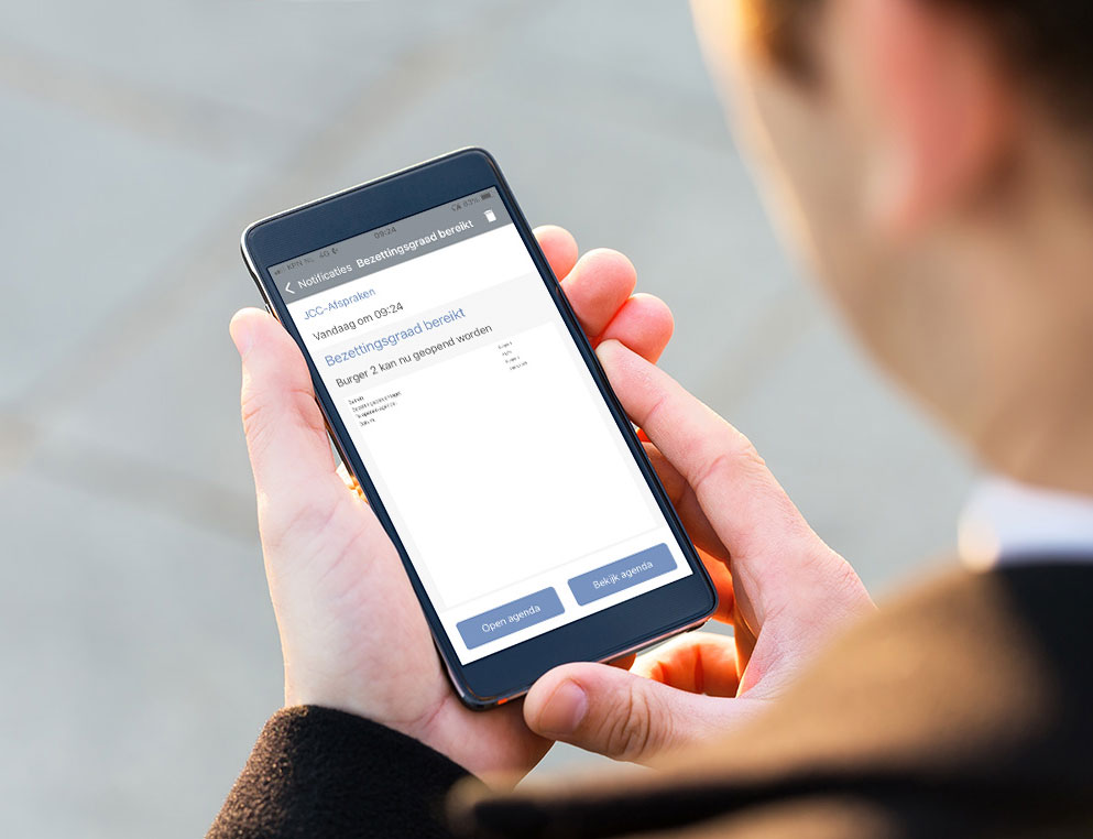 Met JCC-Assistent krijg je binnen JCC-Afspraken notificaties op jouw desktop of mobiele apparaten zodat je op basis hiervan beslissingen kunt nemen. Denk hierbij aan het openstellen van een extra agenda.